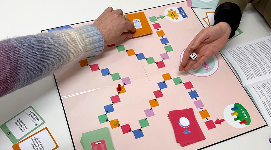 Este juego de mesa ofrece una herramienta interactiva que hace que los participantes avancen por un tablero con casillas de diferentes colores. El color de la casilla determina el tipo de tarjeta que se debe extraer, abordando temas como la autoestima, los cánones de belleza, la cultura de la dieta y la imagen corporal. A partir de las tareas que se plantean en cada tarjeta los participantes aprenden a identificar y trabajar cada uno de estos componentes relacionados con el propio cuerpo y la alimentación.